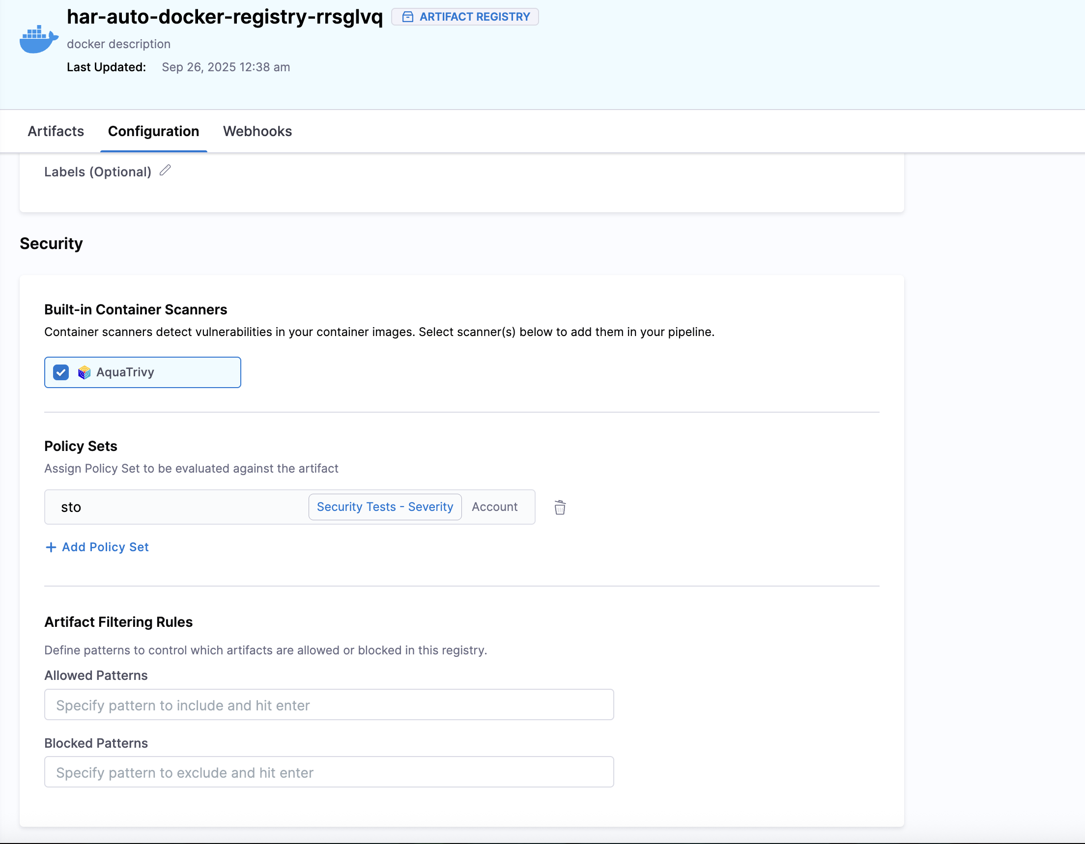 • Manage configuration options relative to your registry type such as setting a security scanner for docker registries.