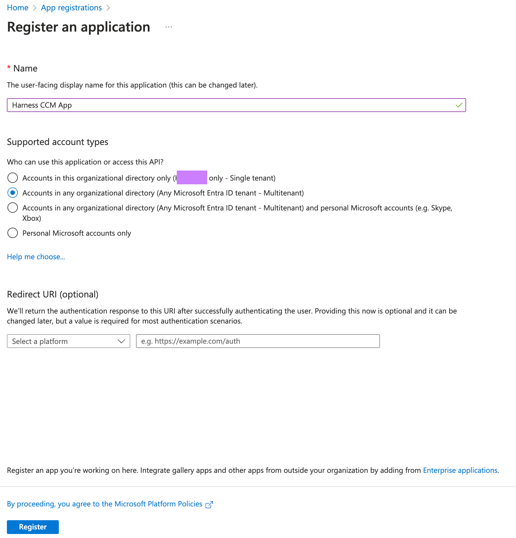 5. Click on Register. For more information, go to Quickstart: Register an App.