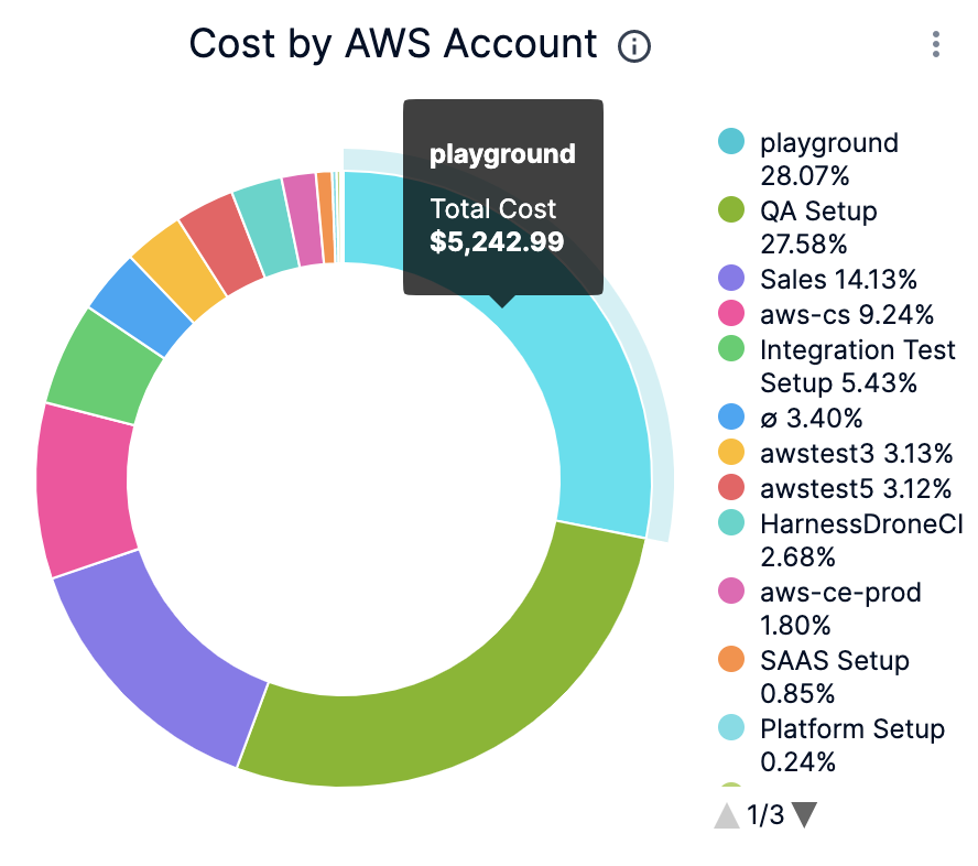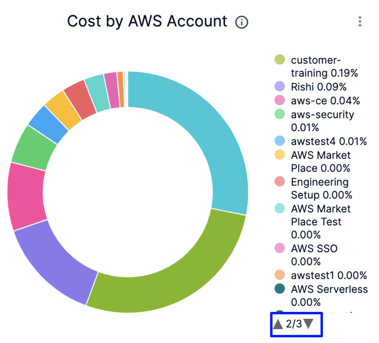 In Cost by AWS Account, click the up or down arrow button to scroll up or down the list. The list shows the percentage of each AWS account with respect to the cost contribution.