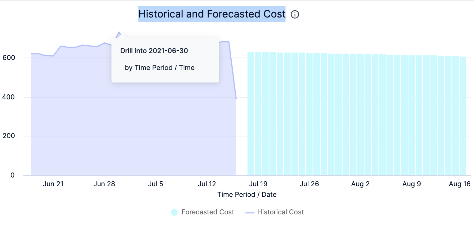 In Historical and Forecasted Cost, click on the chart to further drill into the cost details by Time Period/Time.
