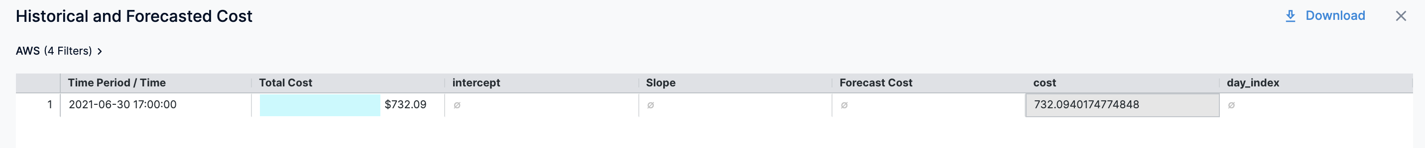 | Forecasted Cost | The forecasted cloud cost with cost trend. Forecasted cost is the prediction based on your historical cost data, and it is predicted for the same future time period as your selected time range. | ![]() |