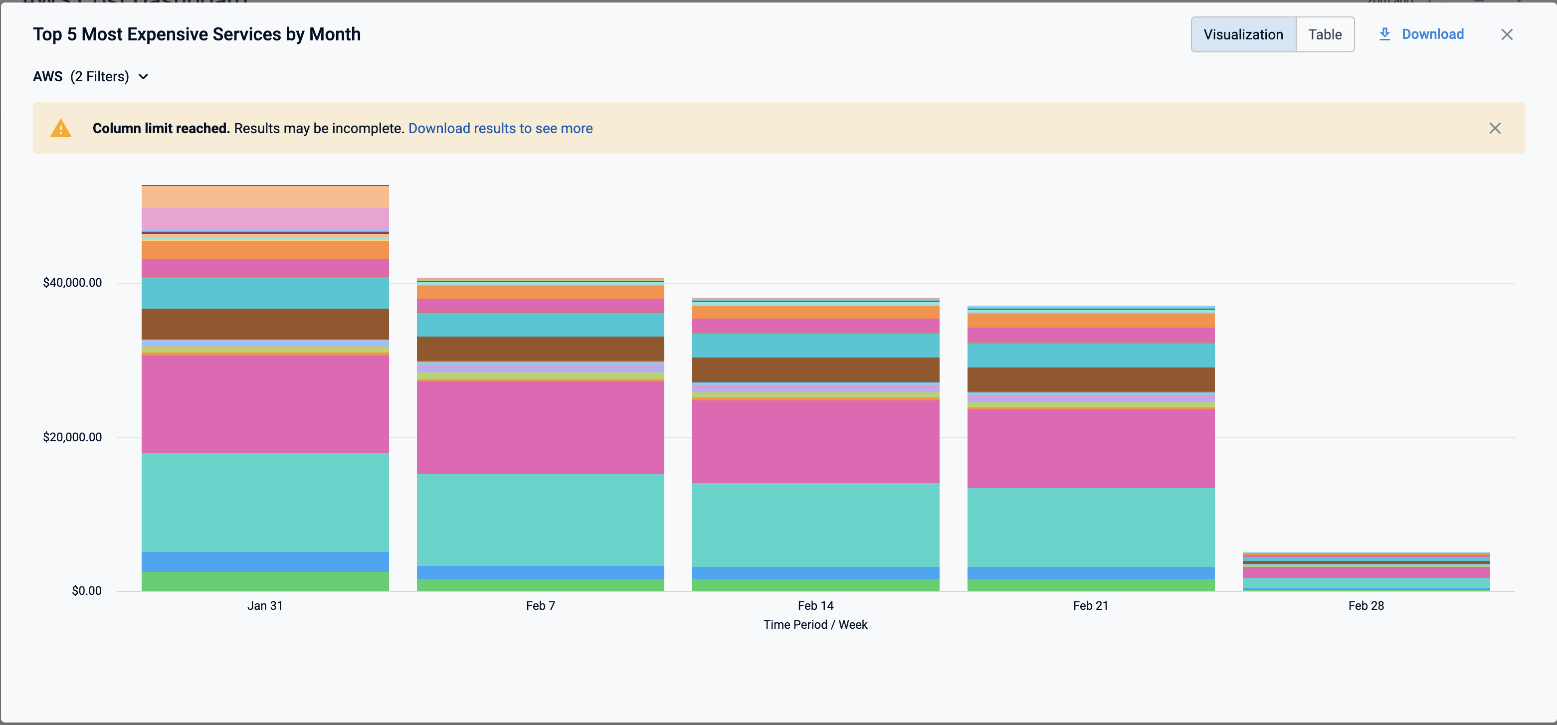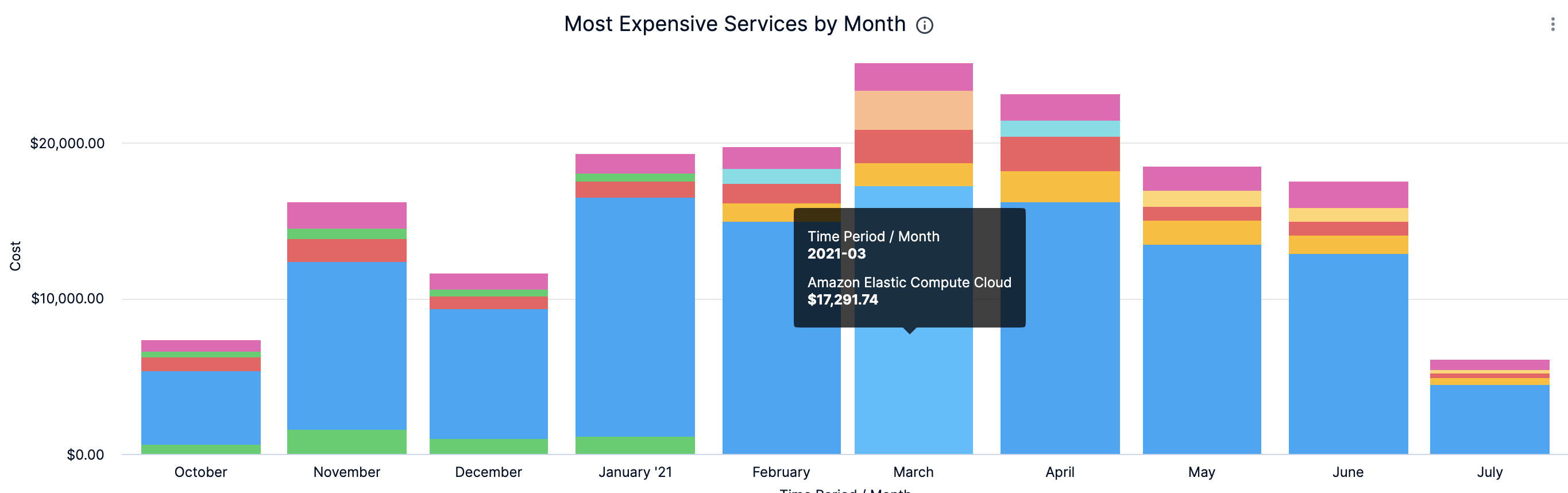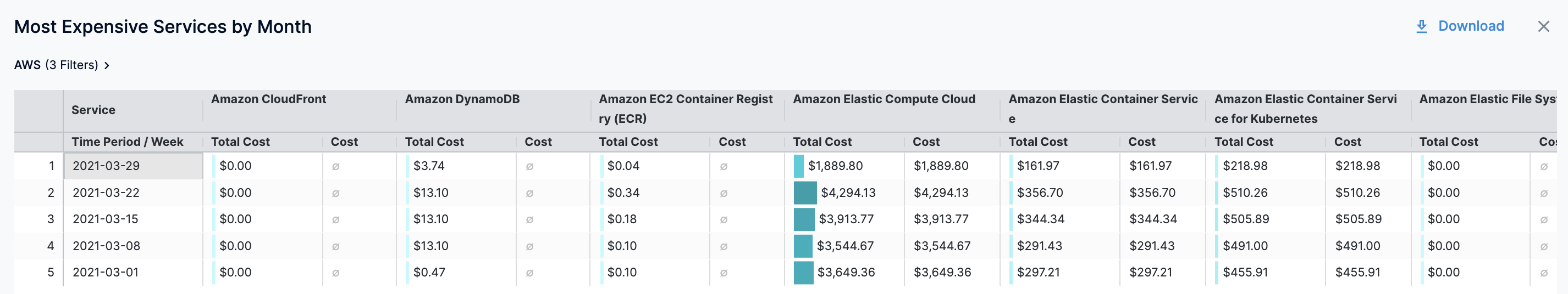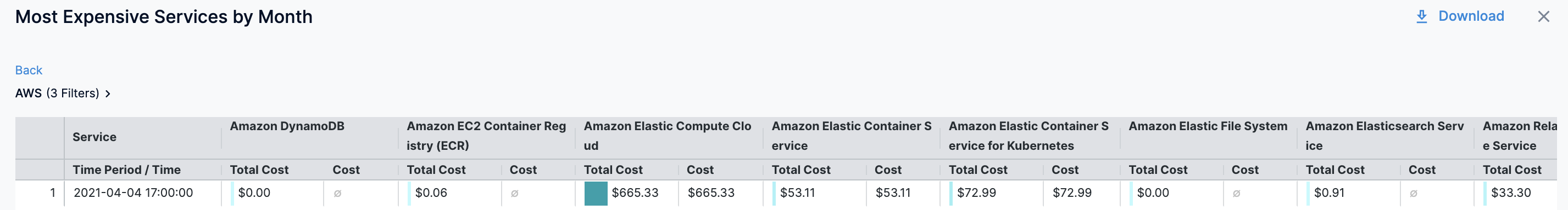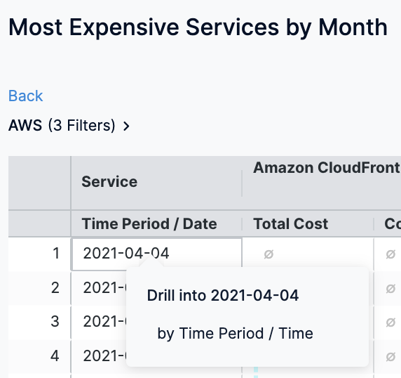 In Most Expensive Services by Month, click on the chart to further drill into the cost details: