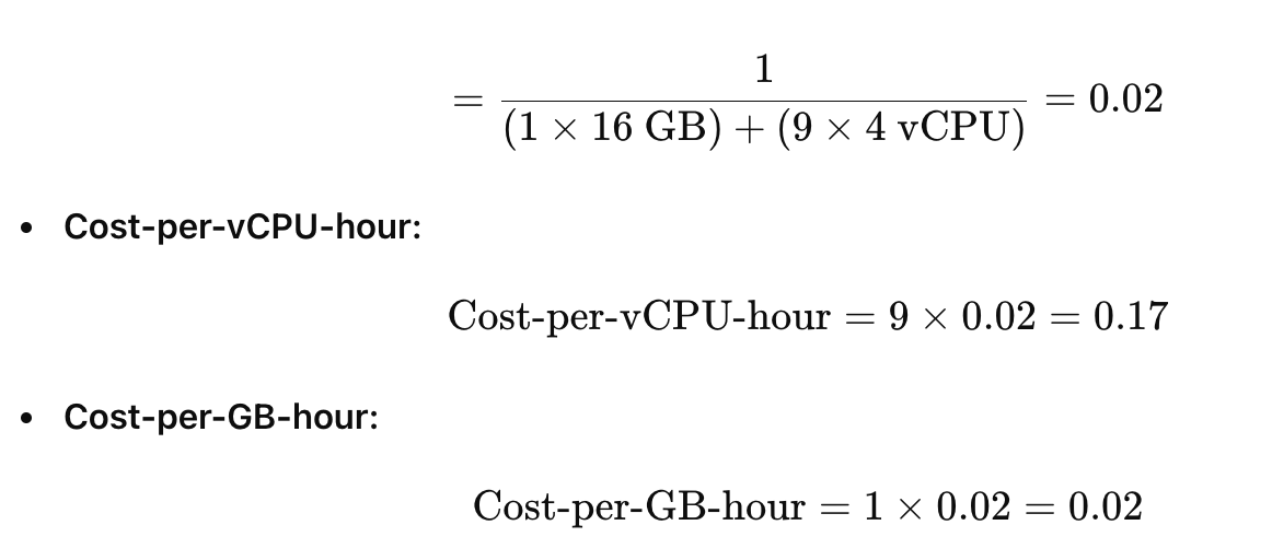 Pod1 Split Cost = (Pod1 vCPU split usage ratio * Total vCPU * Cost per vCPU hour) + (Pod1 Memory split usage ratio * Total Memory * Cost per GB hour)