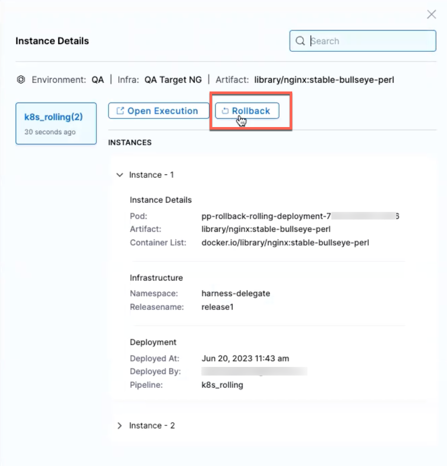 2. Click on View Instance and Rollback. All executions will be displayed along with their environment details. You can only perform a rollback in the Environment view.
