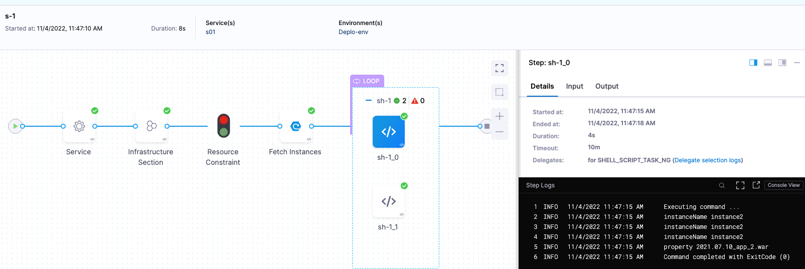 The Fetch Instances step returned two instances and the Shell Script step was executed on both using the loop strategy.