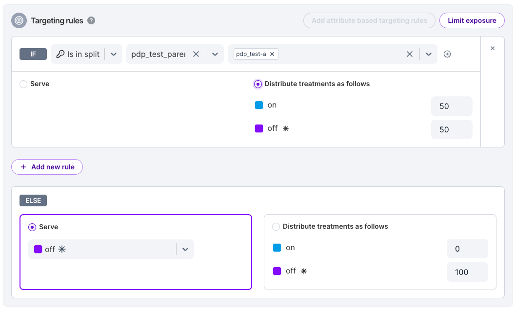 10. Select Distribute treatments as follows and allocate user traffic percentages to this dependent flag’s treatments. For fastest experimental results, you can set on to 50% and off to 50% (or you may enter a smaller percentage for on, to begin a gradual rollout of the php-test-a feature).