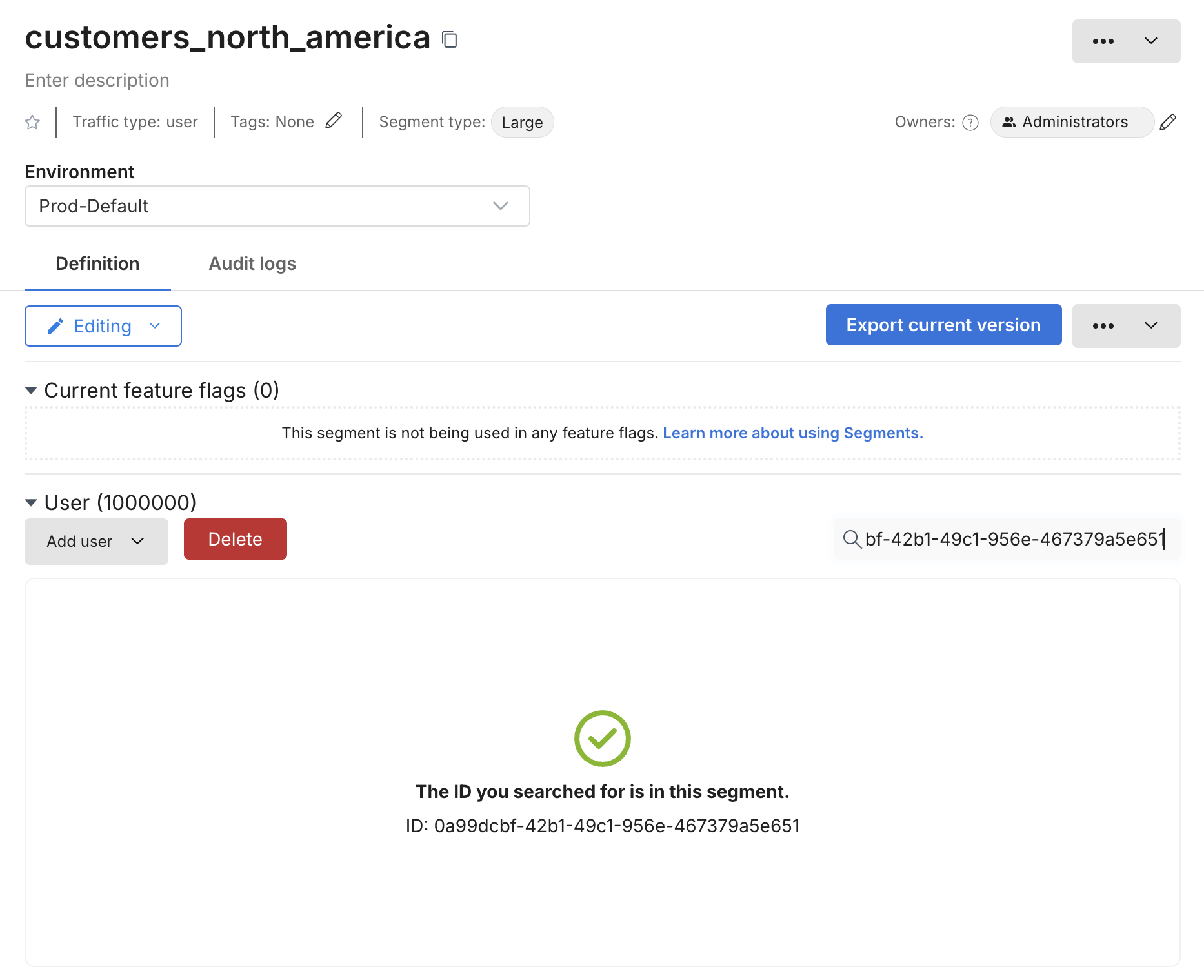 - In Harness FME, you can search a Large segment for a given User ID, but the full list of user IDs in a Large segment cannot be displayed.