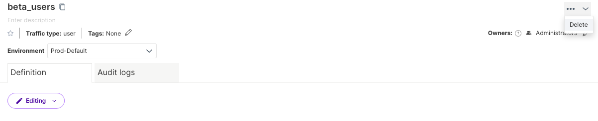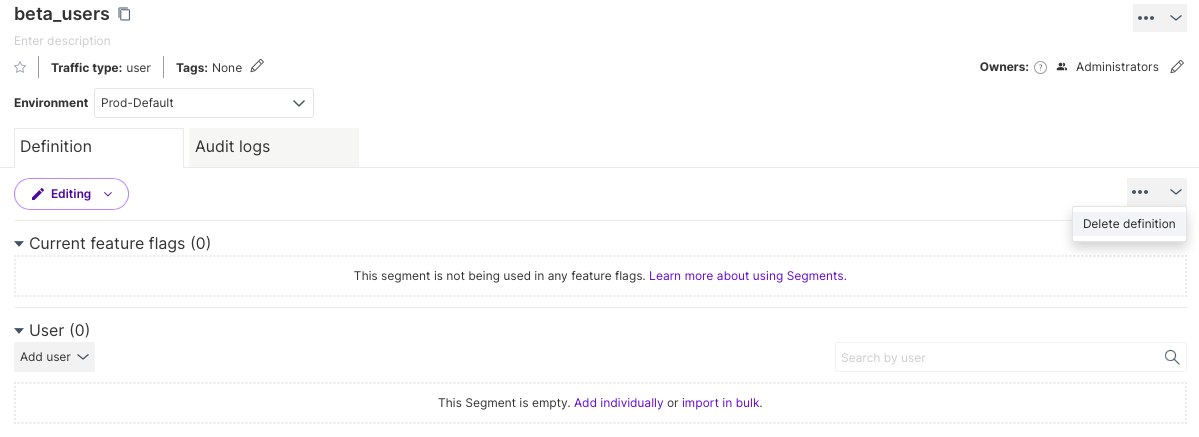 Once the keys are deleted, delete the segment definition by clicking on the Ellipses icon in the Definition section and selecting Delete definition.