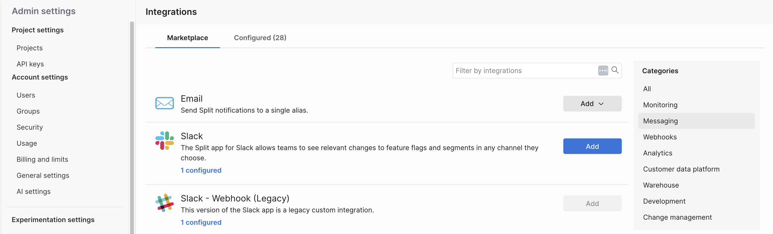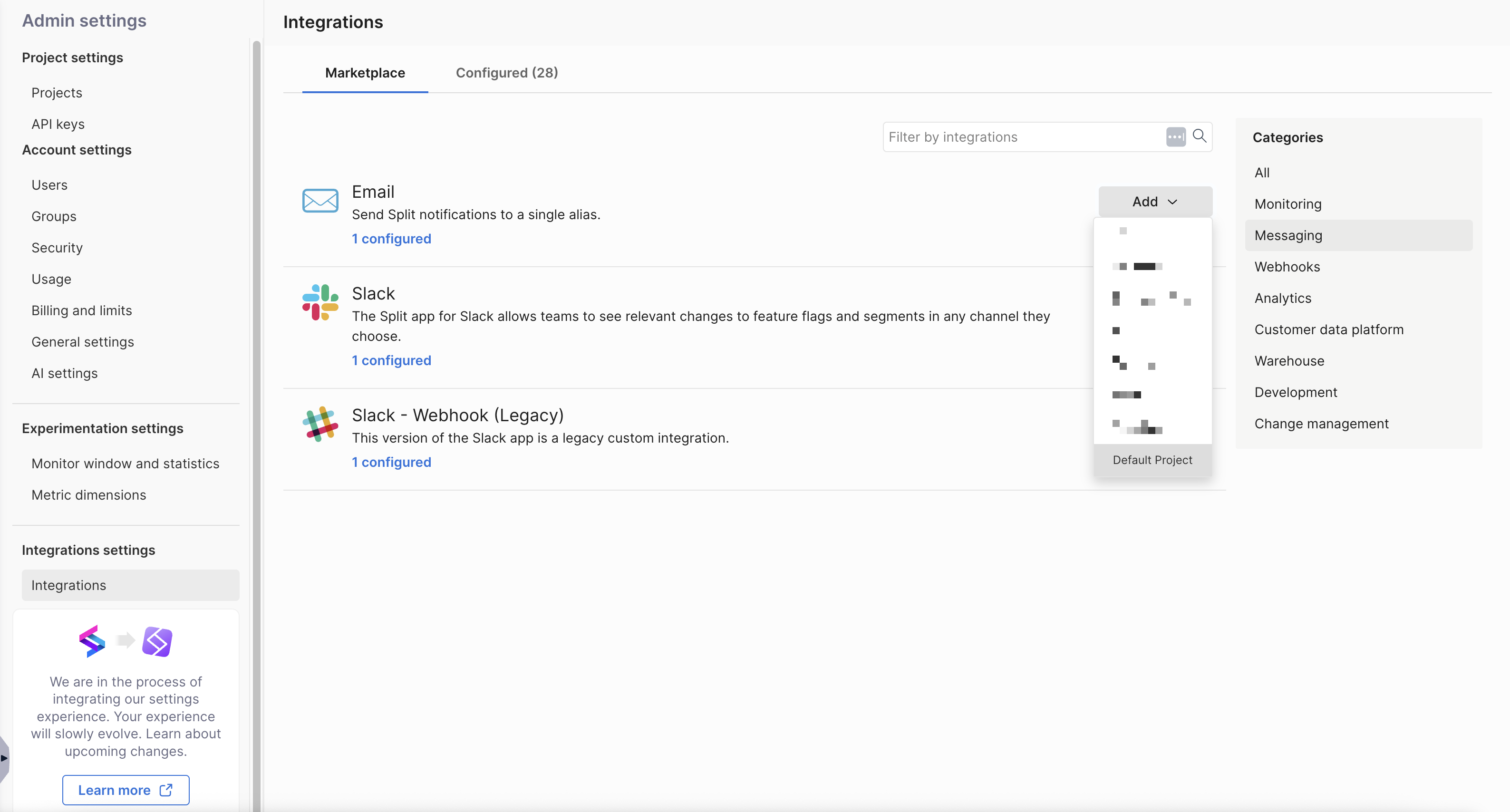 2. Click the Add dropdown menu and select a project where you want this integration to apply to (for example, Default Project).