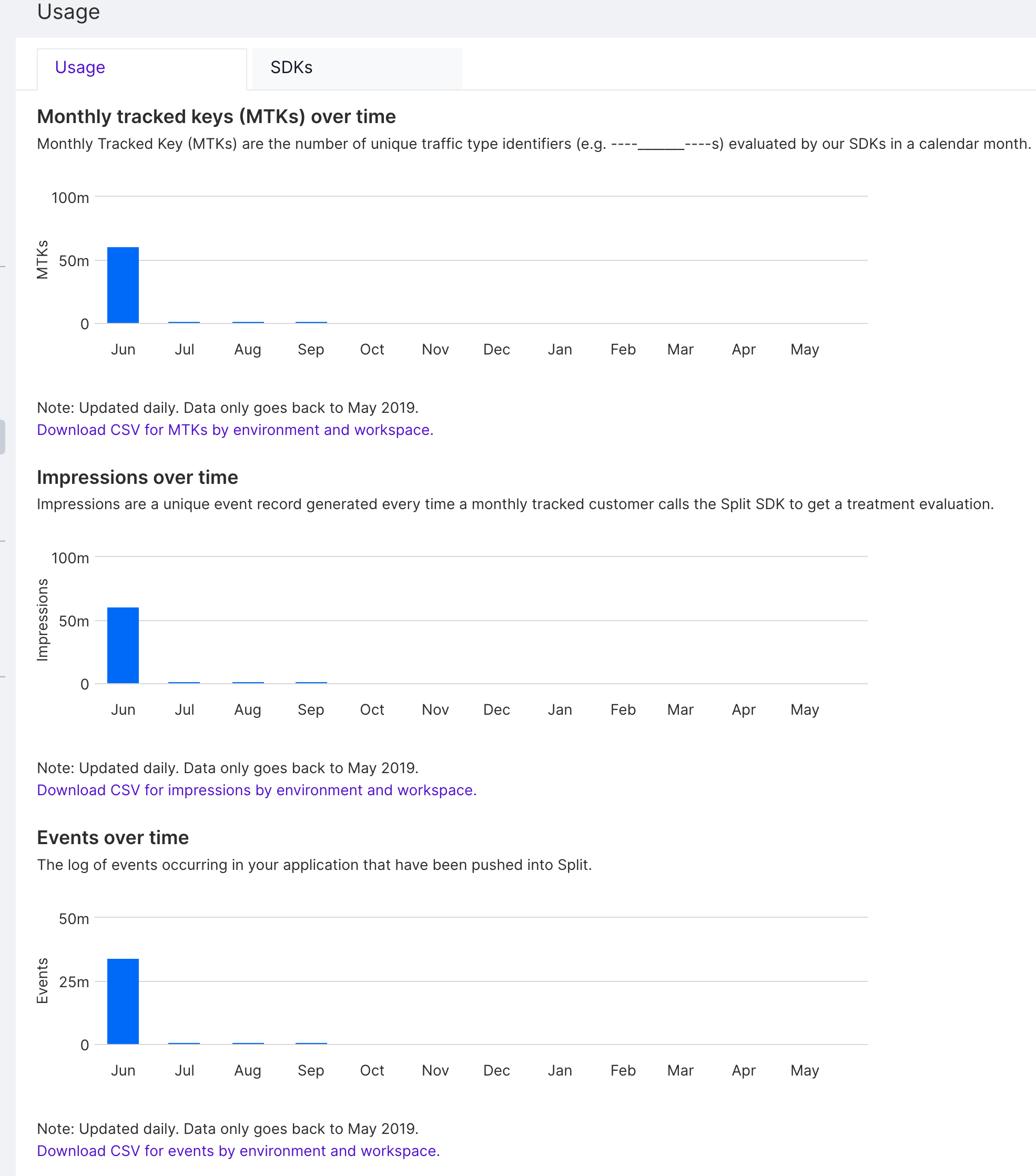 Each of these reports is available as an exportable CSV, which can be downloaded by selecting the "Download CSV" link below each chart. For additional usage data, contact our Support team at support@split.io.