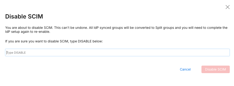 2. Click the SCIM toggle. A message appears with a text box to type DISABLE.