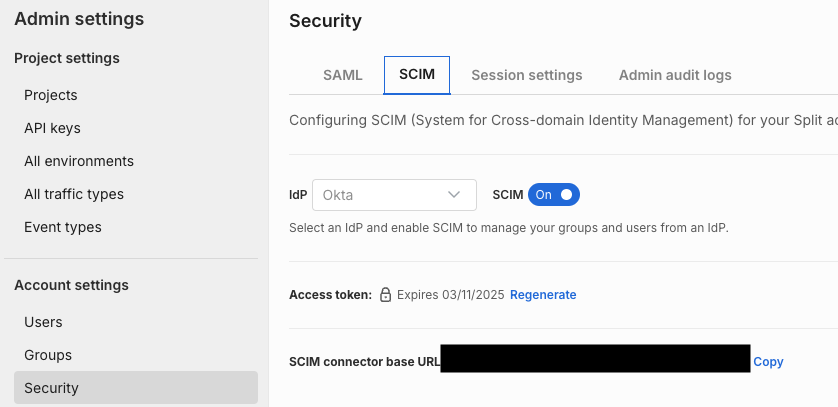 • In the SCIM connector base URL field, copy and paste the connector base URL generated in Split when you enabled SCIM.