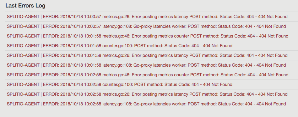 SPLITIO-AGENT  - DEBUG - 2020/10/12 21:41:51 logger.go:35: GET |500| 285.71µs | 10.10.6.249 | /api/splitChanges