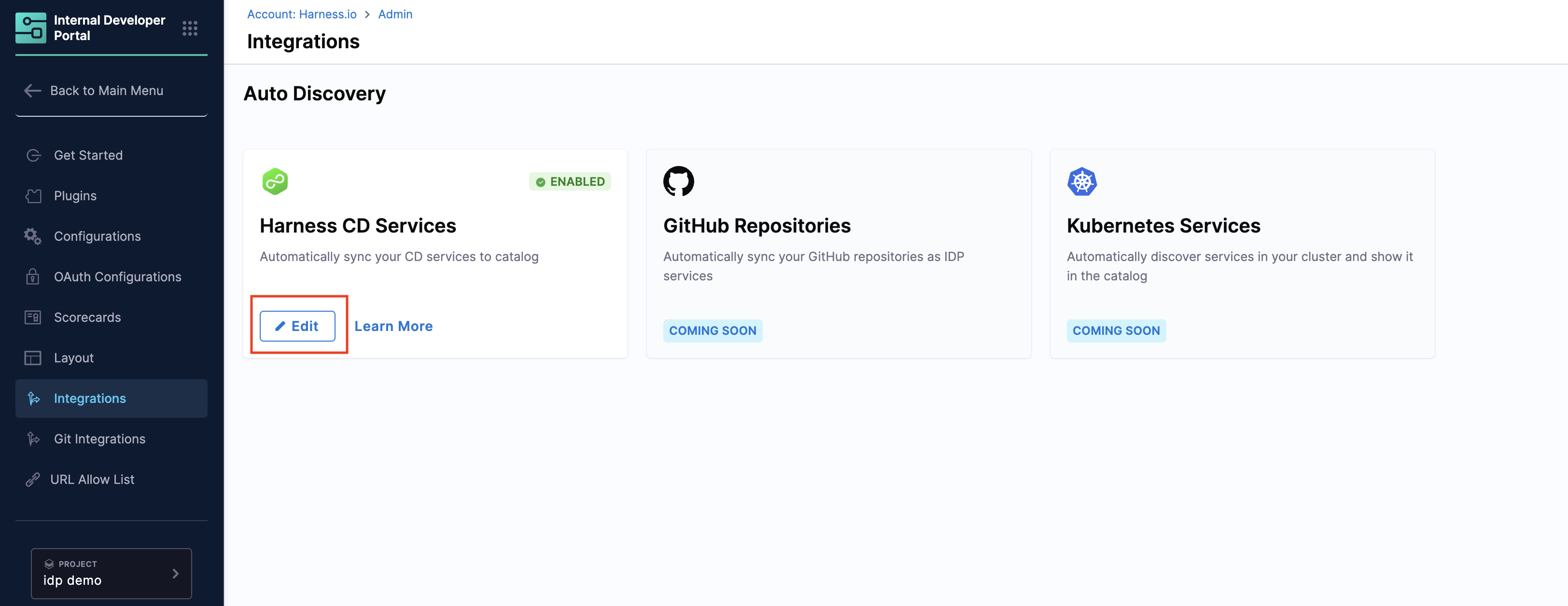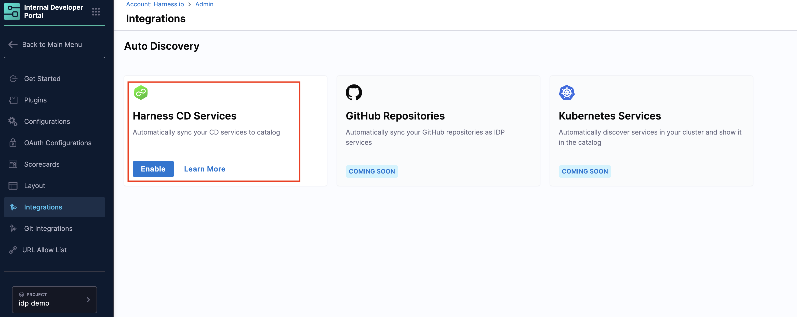 IDP_CATALOG_CD_AUTO_DISCOVERYis enabled. Contact Harness Support to enable it. - Harness CD is enabled for your account. This must be the same account you use for Harness IDP.