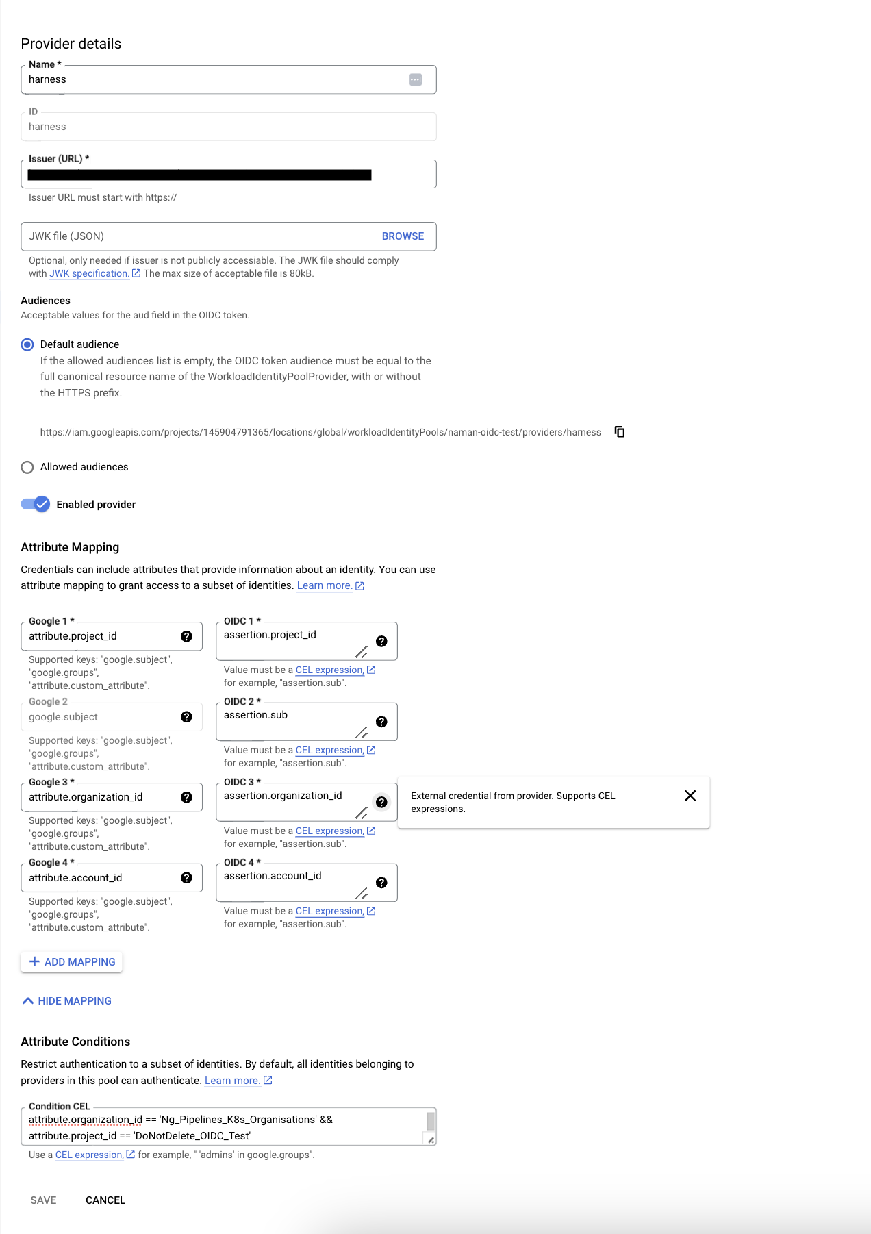 projects/421331508843/locations/global/workloadIdentityPools/harness-pool - Provider ID: