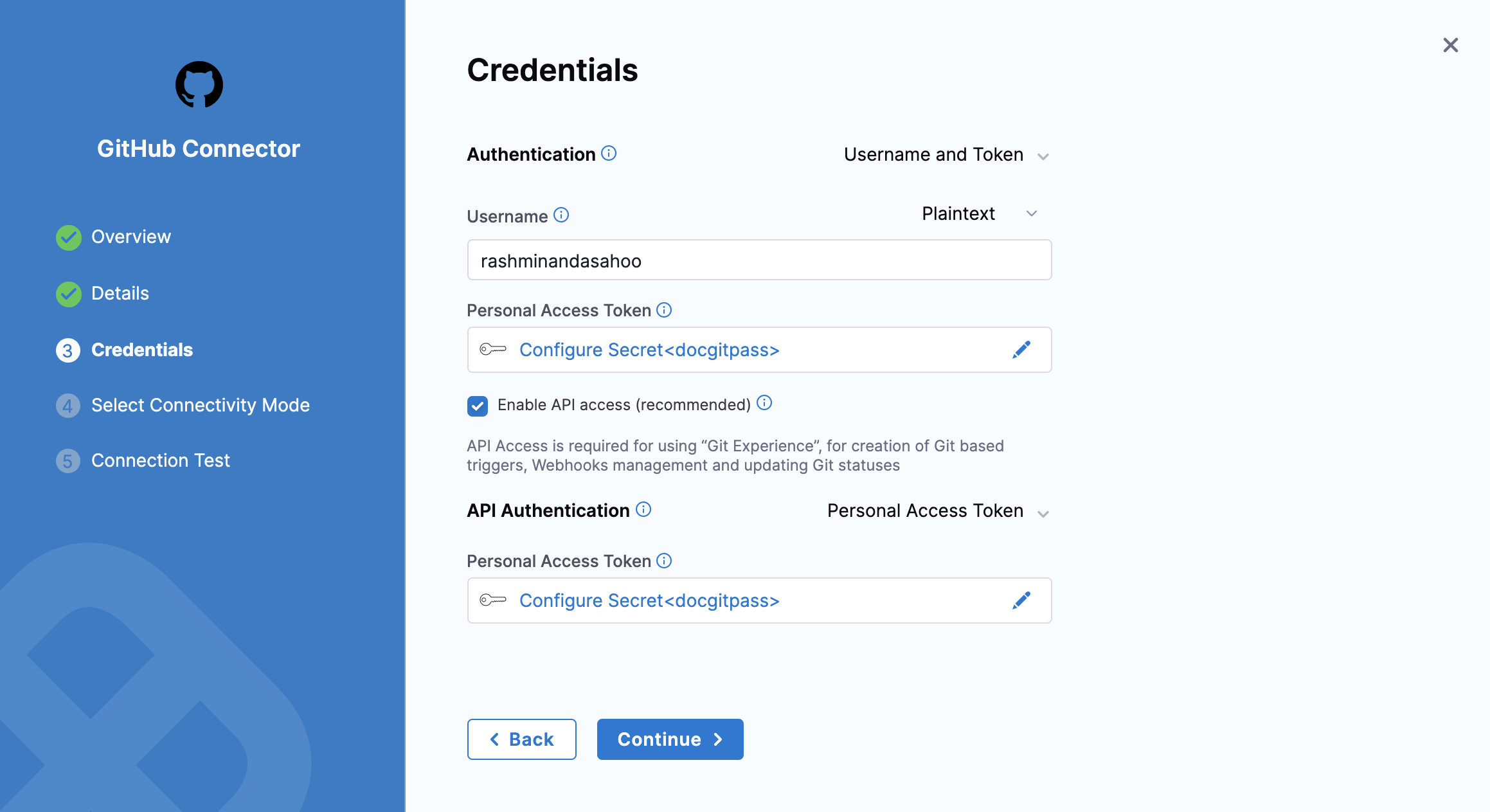 With Username and Token authentication, use the same personal access token secret for both Personal Access Token fields.