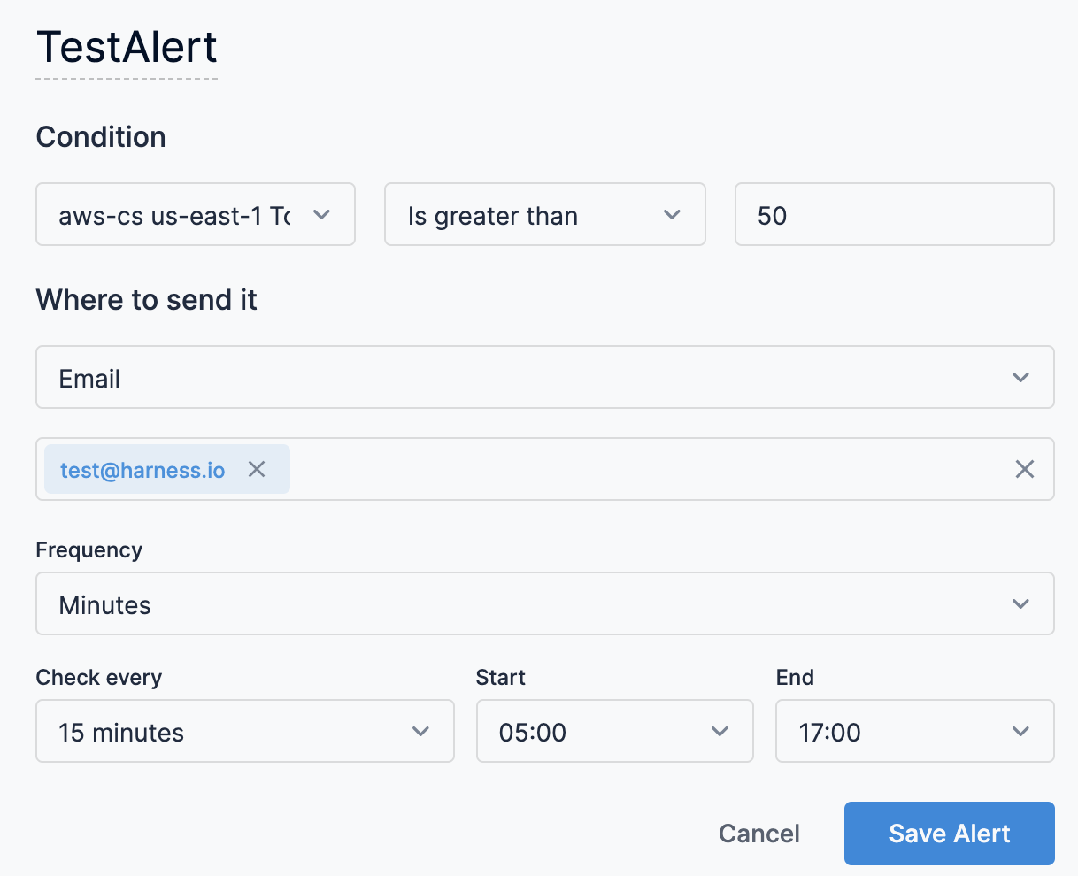 • 30 minutes****Start and End times are inclusive. For example, if you set Check every to 12 hours with a Start time of 05:00 and an End time of 17:00, Dashboard will check the data at 05:00 and 17:00