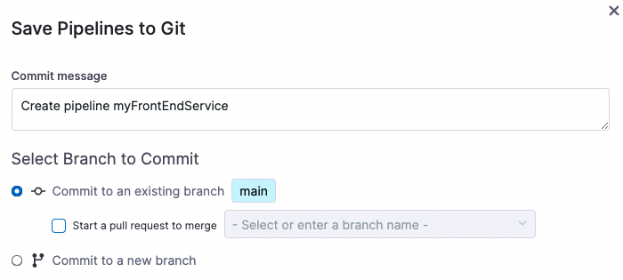 Select the branch where you want to save the pipeline and select Save. You generally want to save it to the default branch on the first save. You can then create different branches in the Harness repo if you want to create different versions of your pipeline.