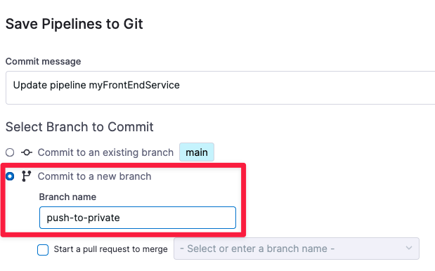 2. Select Commit to a new branch and enter the branch name. In this case, we save the pipeline in a new branch push-to-private: