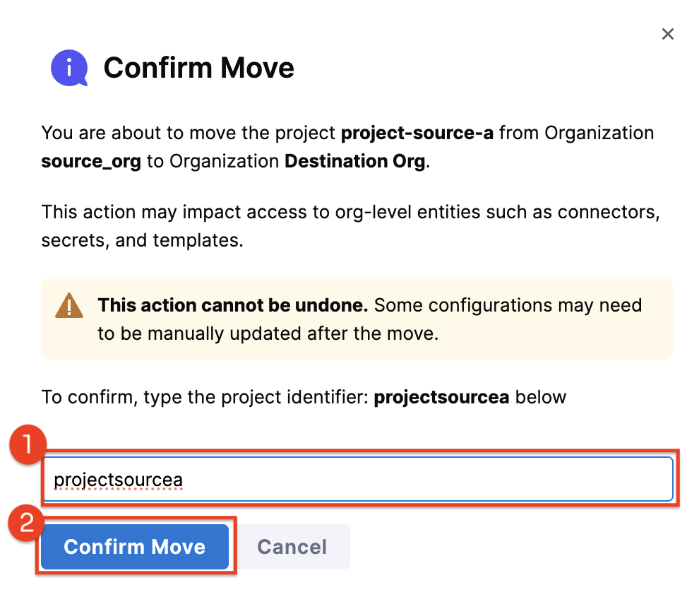Select the destination organization from the dropdown where you want to move the selected project.
