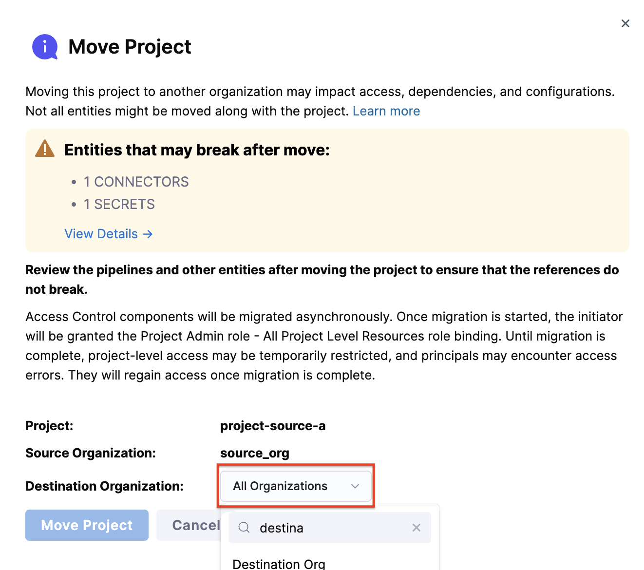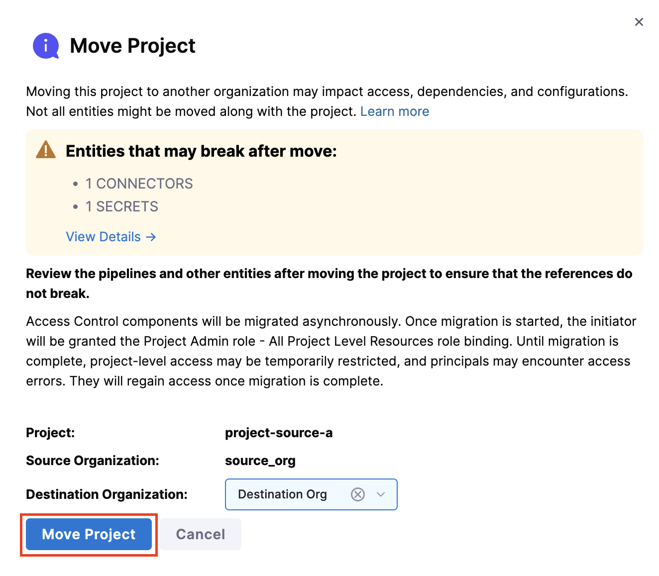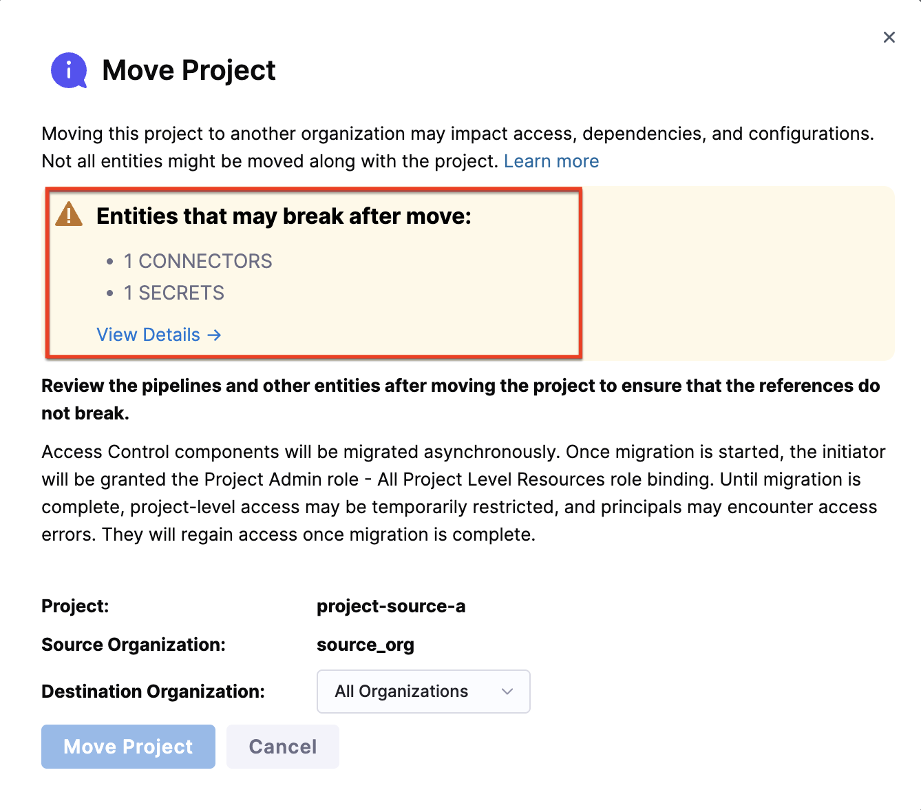 Once the move is complete, you'll be redirected to the project in its new organization. A banner will appear stating: This project was recently moved from another organization. Some entities may reference resources that no longer exist. and you can also view the new destination organization, as shown in the image below.