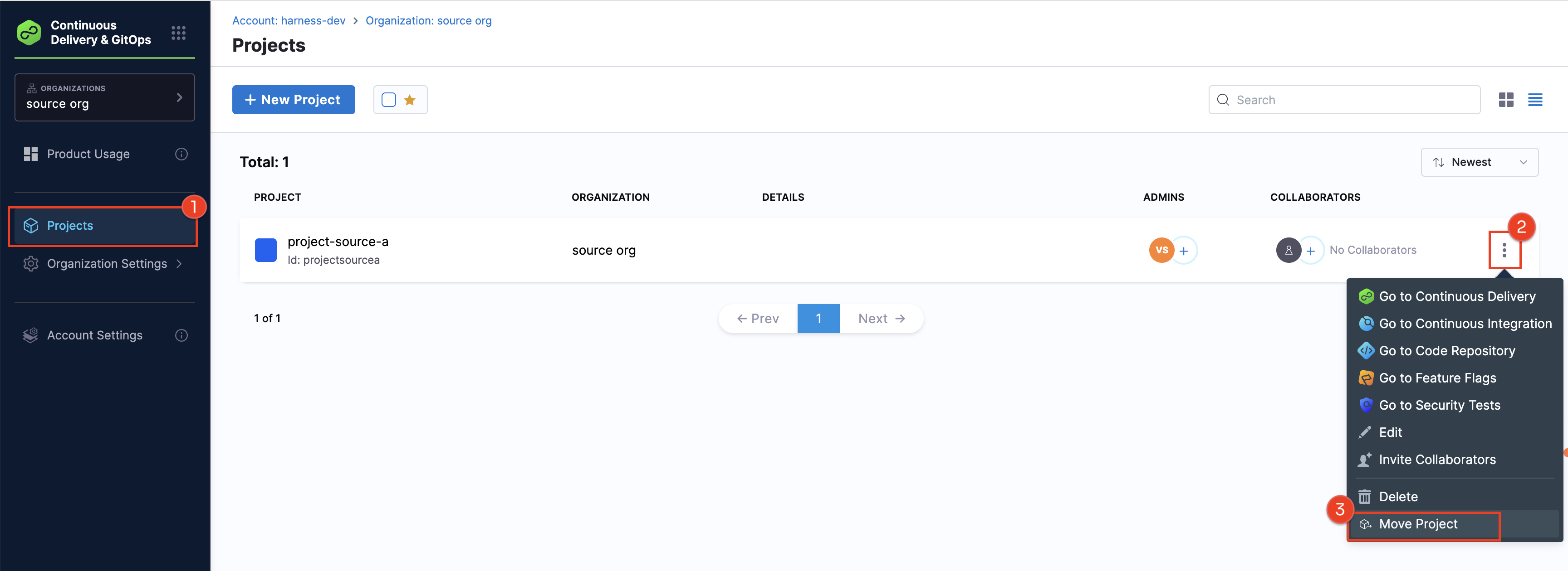 Navigate to the source organization in your account and locate the project you want to move.