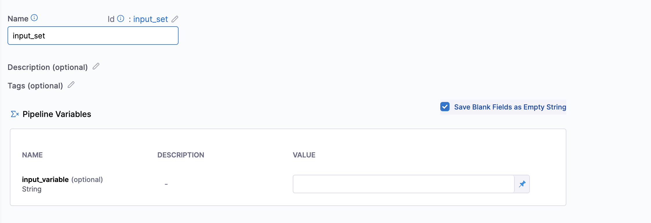 - Show checkbox to Save Blank Fields as Empty String: When enabled, this setting shows the checkbox Save Blank Fields as Empty String both when creating the input set in the Input Set section and when creating an input set in triggers, as well as in the Pipeline Run form.