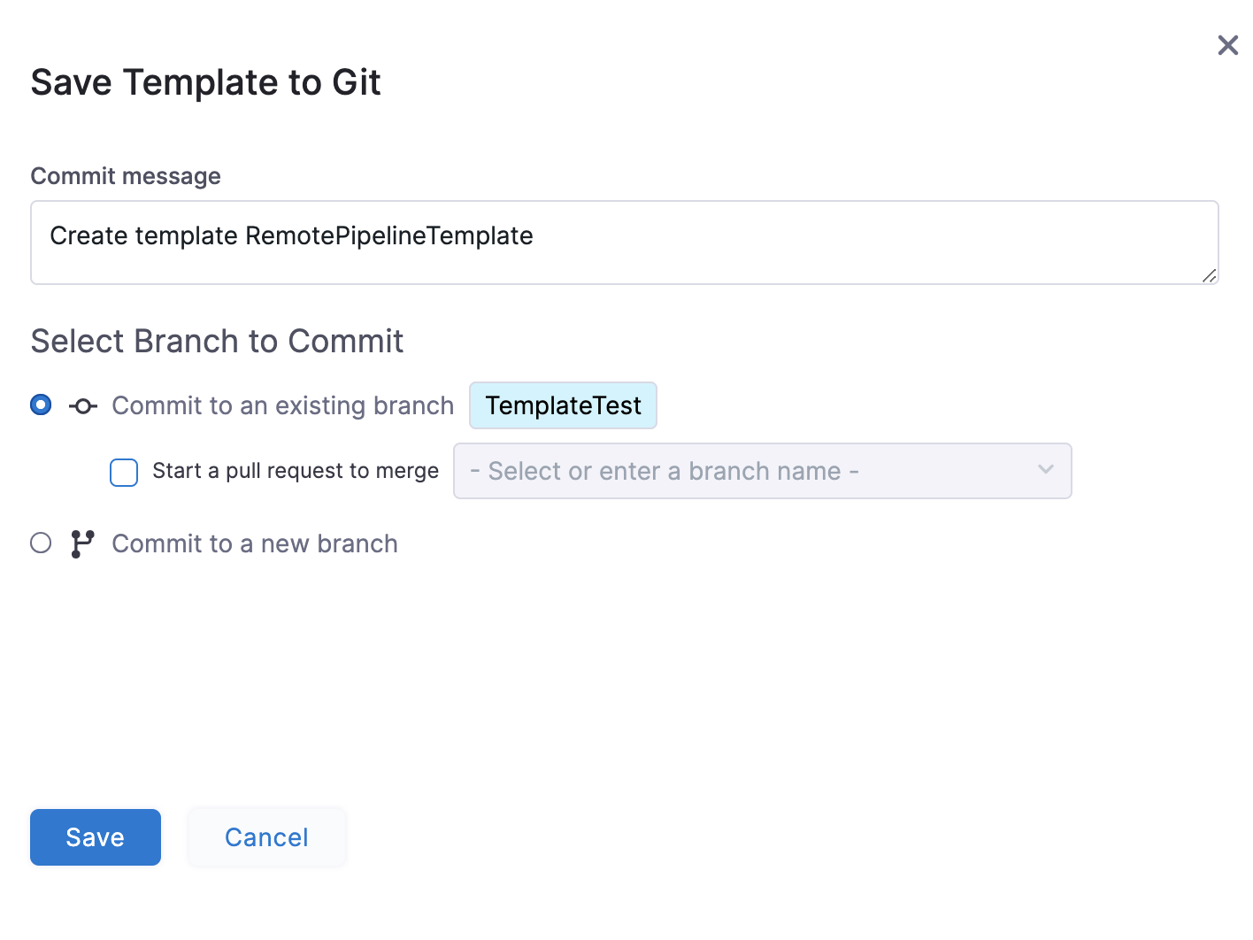 2. Select Save. Your remote pipeline template is saved to the repo branch.