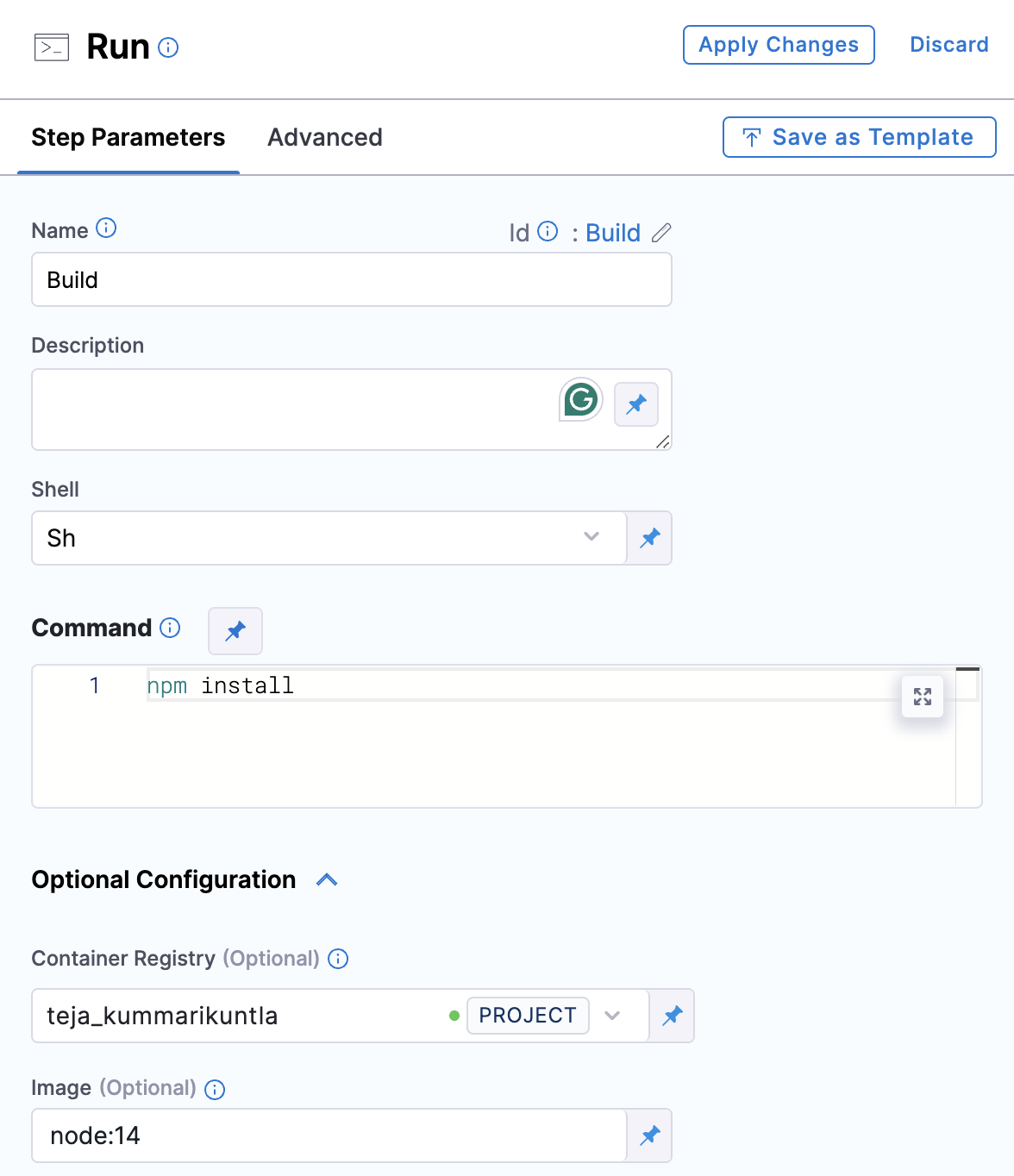 npm installoryarn installfor JavaScript projects. - Under Optional Configuration, configure your container registry and the image that facilitates your project build.