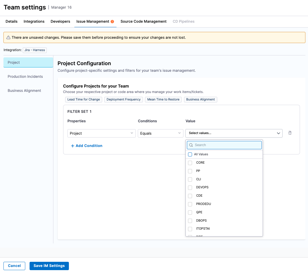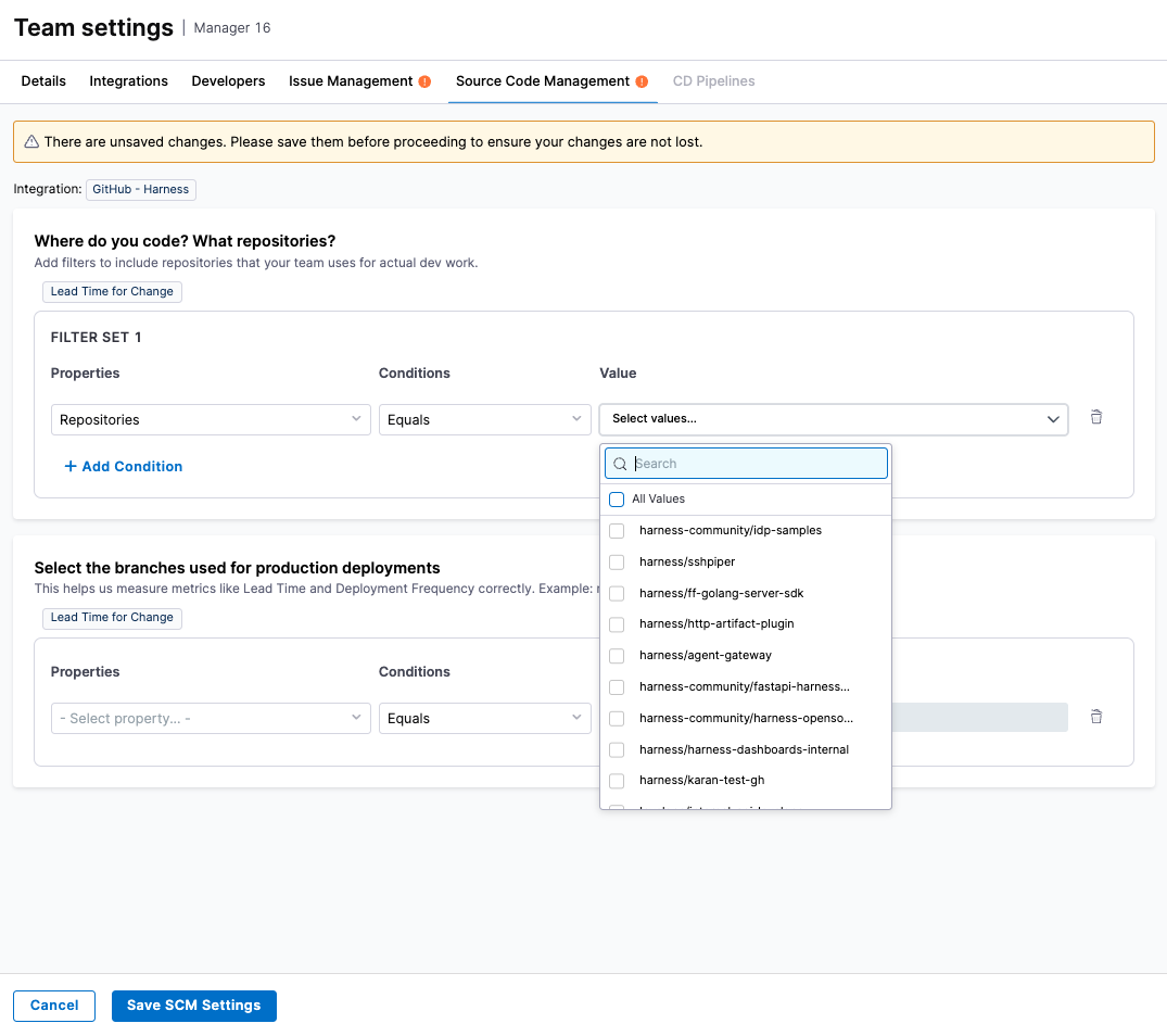 • Contextualized and metric specific settings: Teams include metadata such as associated integrations, relevant services, repositories, destination branches, pipelines, environments, etc.