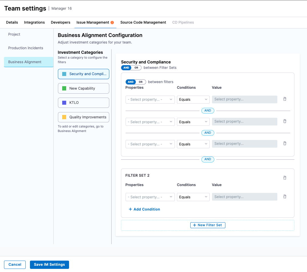 Business Alignment categories (e.g., Strategic Work, Tech Debt, Customer Commitments) are centrally defined by the SEI Admin in the profile and apply across the organization. Teams configure how to filter work items into these categories using their own logic.