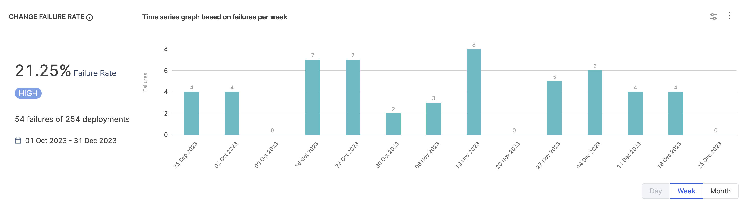 Change Failure Rate represents the percentage of deployments that cause a failure in production. To monitor Change Failure Rate in SEI, you will again need to associate the widget with an existing workflow profile.