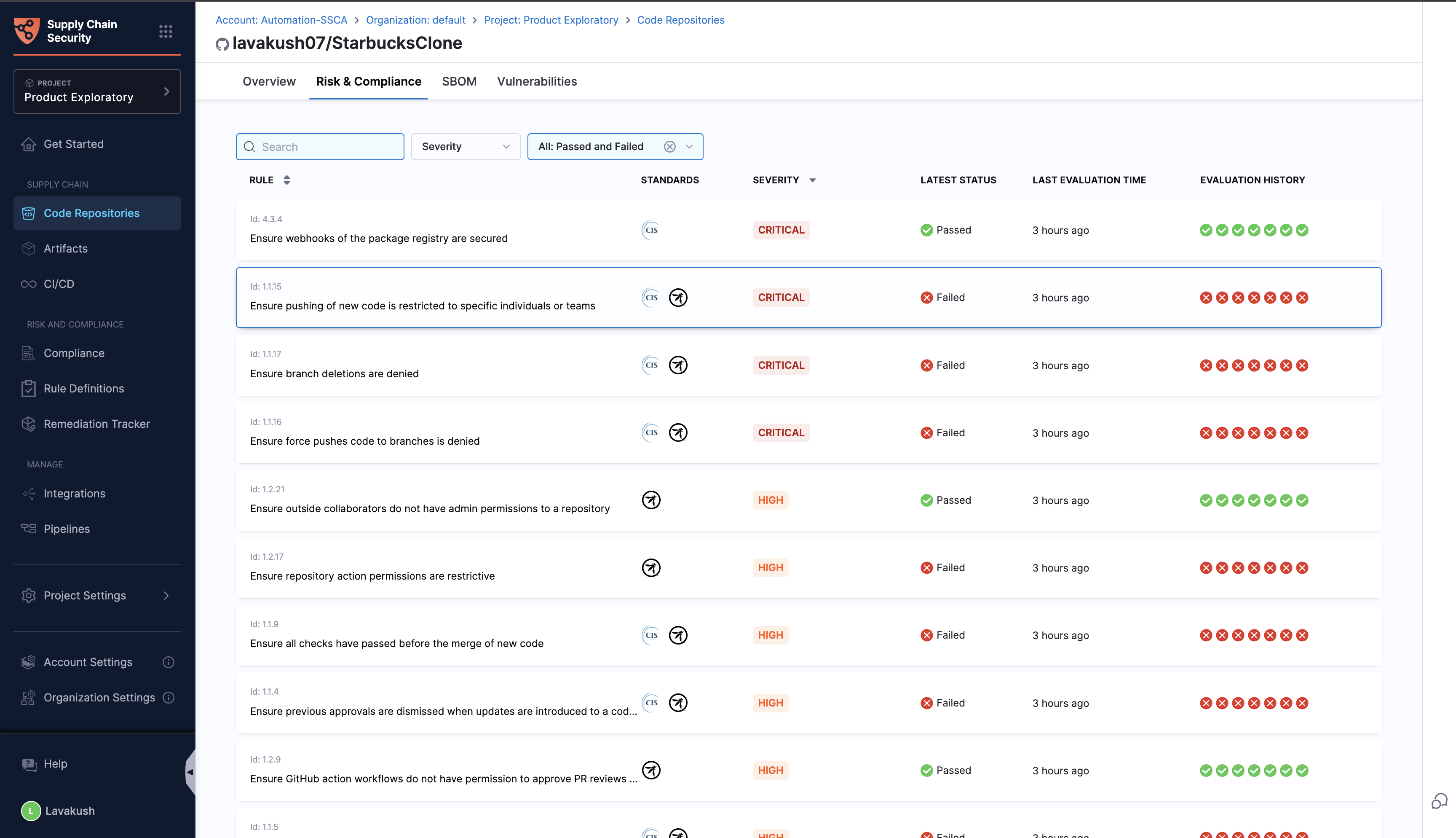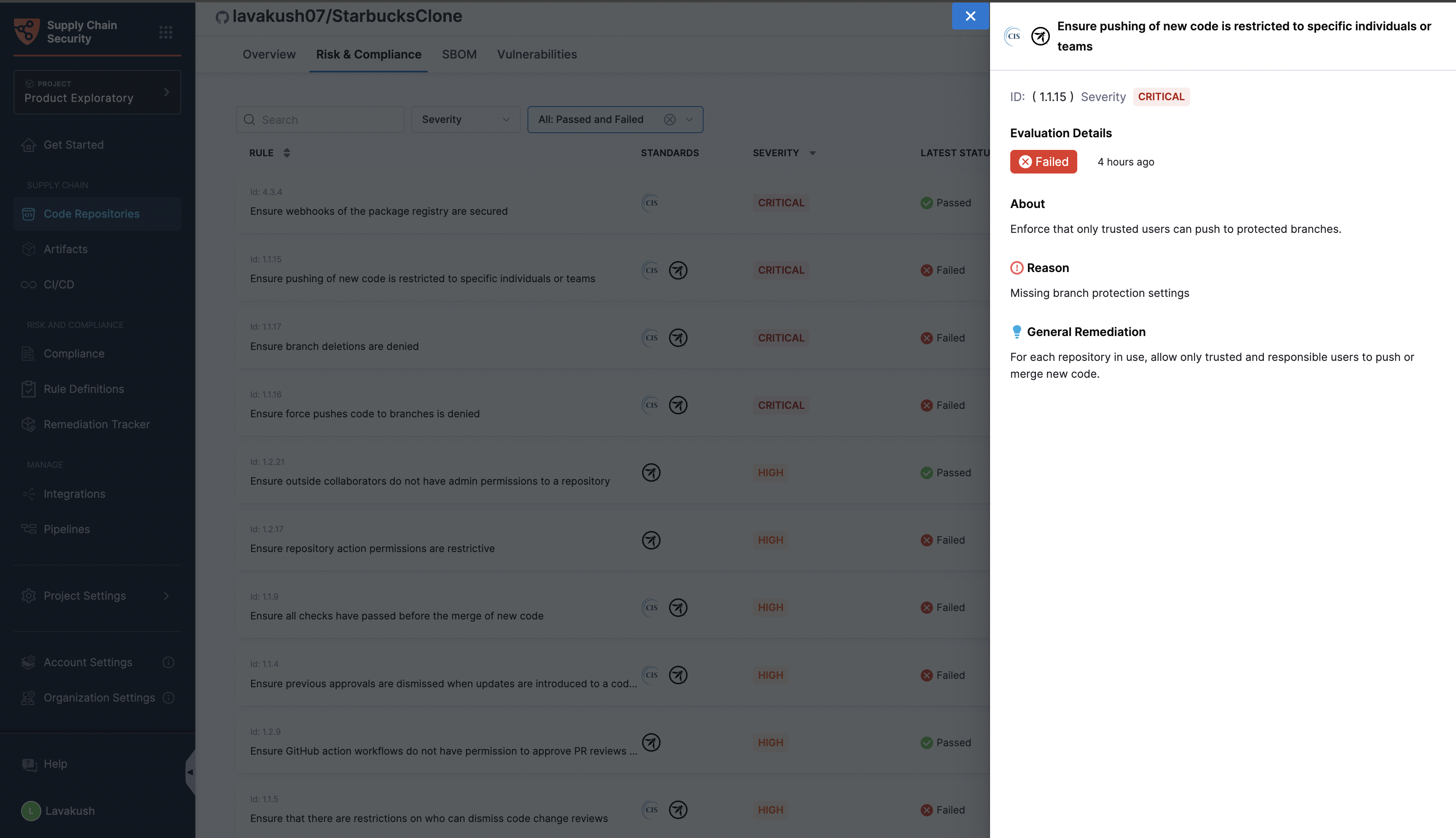 Understanding the security and risk posture of your code repositories is crucial for maintaining a secure development environment and preventing supply chain attacks. This section provides a comprehensive overview of the security and risk posture by presenting detailed insights into various aspects of your repositories. It highlights all the issues related to risk and compliance derived from the code repository configurations generated by applying industry-standard software supply chain benchmarks such as CIS, OWASP Top 10 CI/CD Security Risks etc.