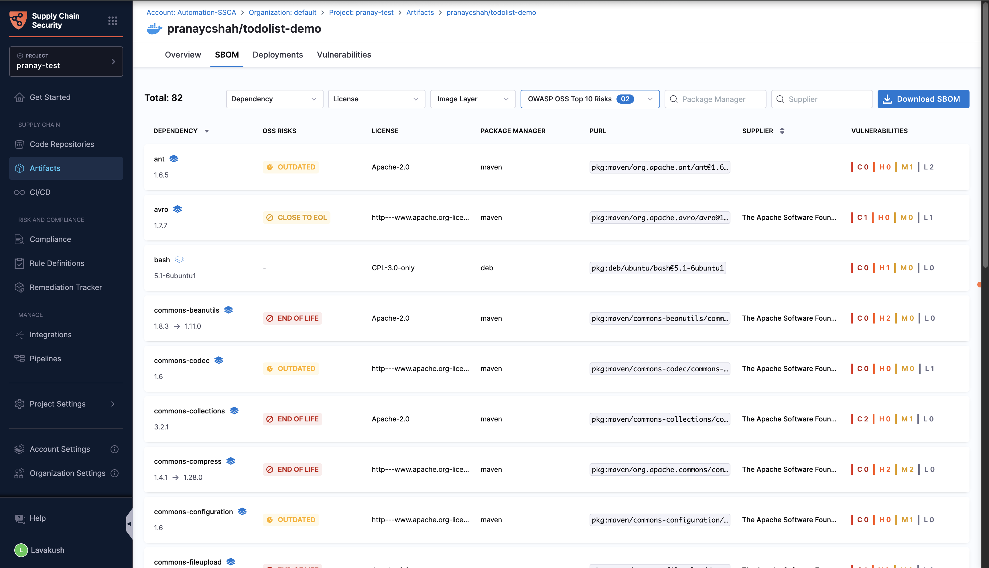 • Added support to manage the OWASP Top 10 risks, enables you to easily identify outdated, unmaintained, close to end of life, and end of life components, and create Jira ticket to update package version.